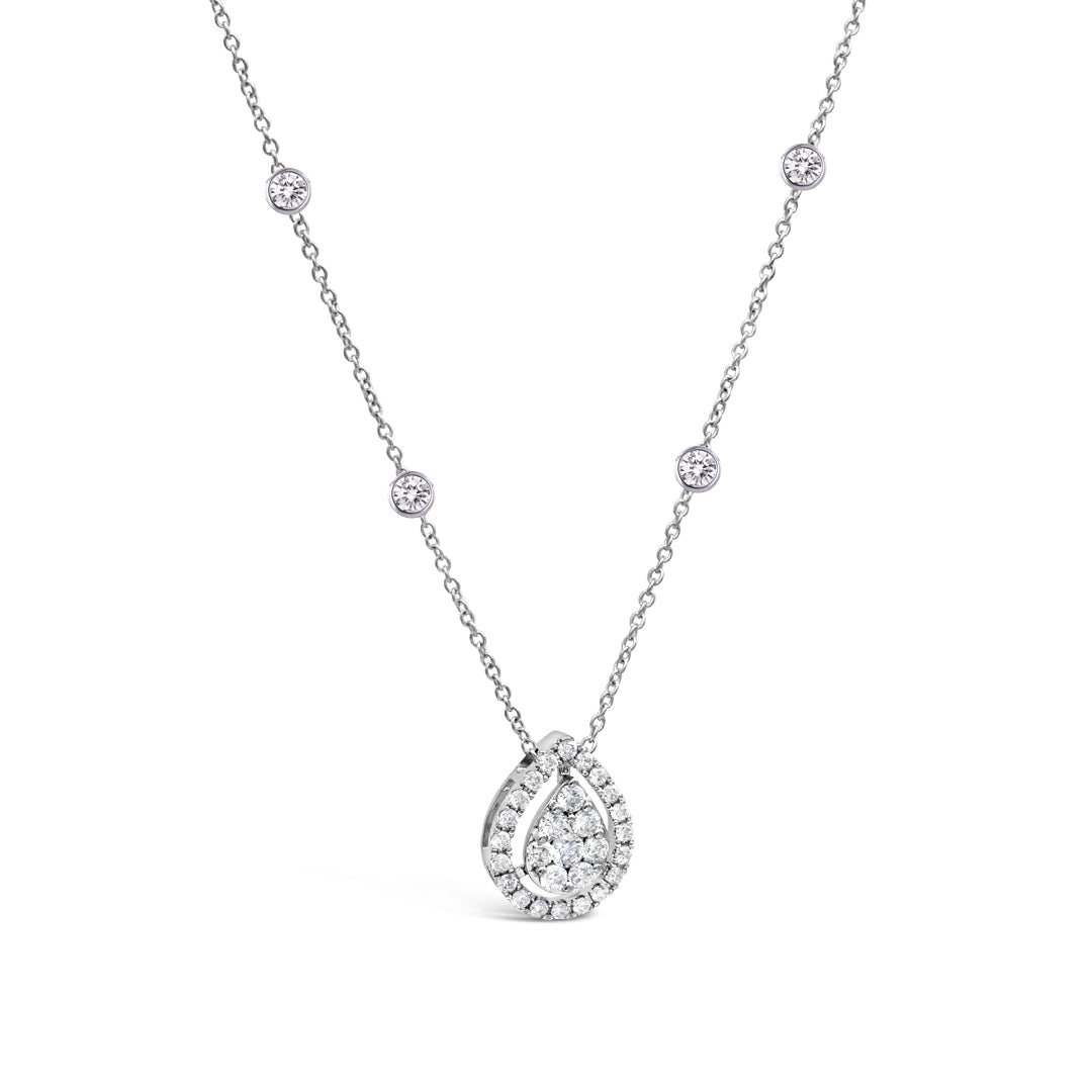 Dare to make a statement with this striking framed pear diamond necklace. The distinctive pear-shaped diamond commands attention, elegantly framed to amplify its brilliance and create a bold focal point at your neckline.