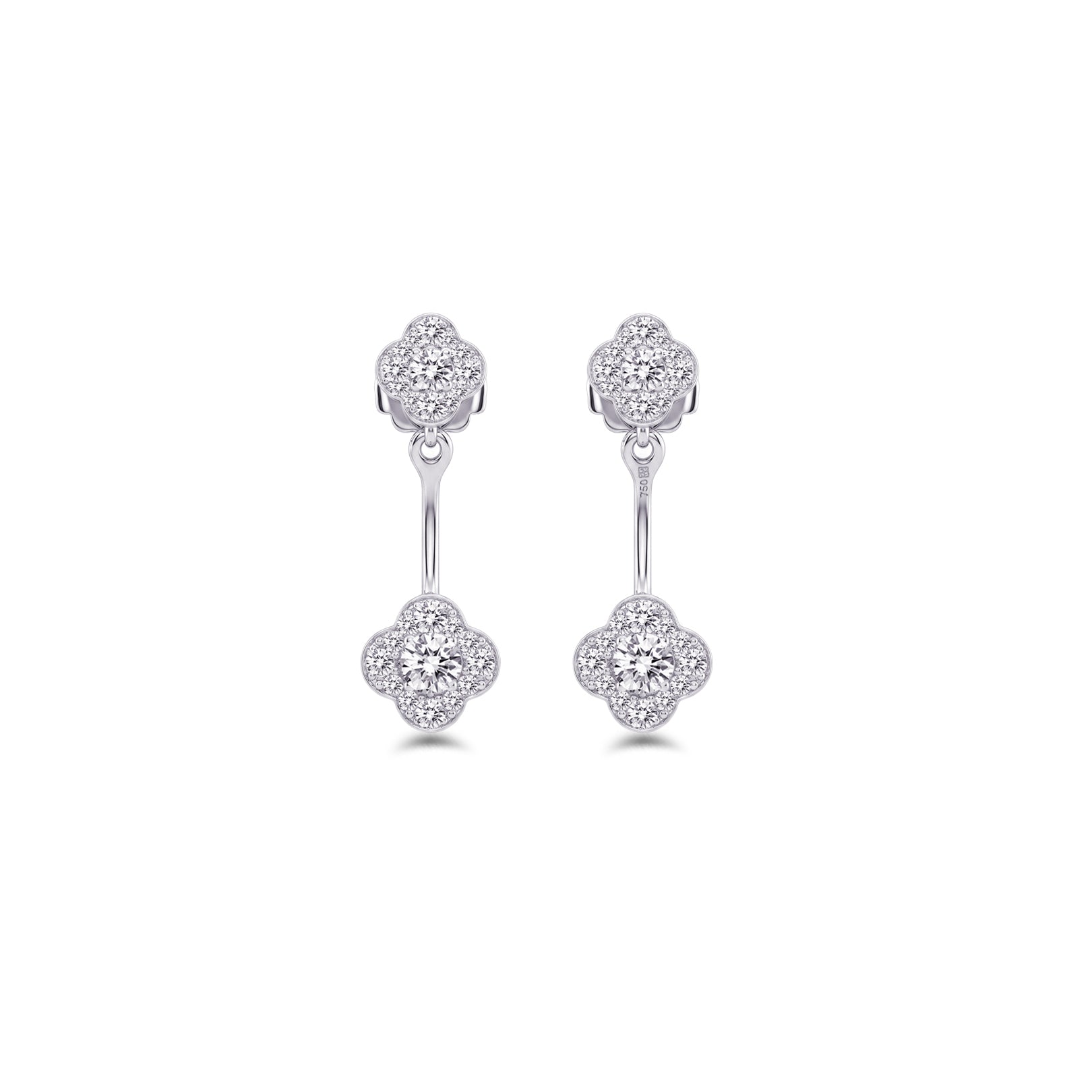 . Each earring features a delicate clover motif adorned with sparkling diamonds, creating a graceful silhouette that catches light beautifully.