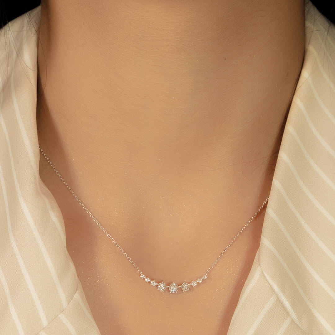 This elegant One Line Separate Stone Diamond Necklace features individually set diamonds that catch the light beautifully, adding a subtle sparkle to any outfit. Offering a timeless accessory that complements your style with grace and sophistication.