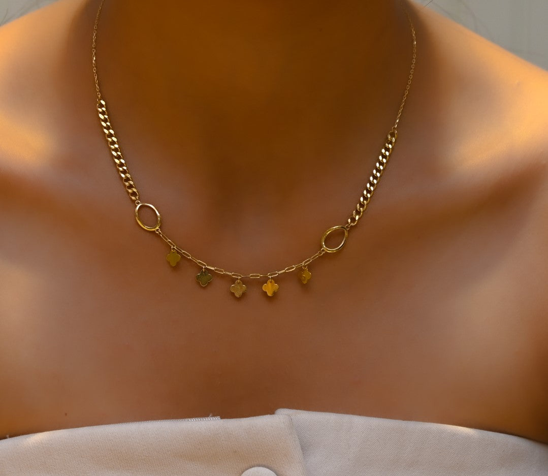 Elevate your style with our MODERN DUO CHAIN FOUR-CLOVER GOLD NECKLACE. This trendy piece features a unique duo chain design and a symbolic four-leaf clover charm for a modern and chic look.
